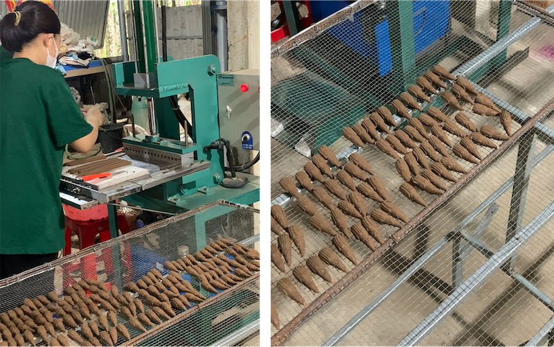 Nụ, nhang, que trầm không tăm sau công đoạn tạo hình sẽ được phơi khô hoặc sấy trong lồng sấy với nhiệt độ đảm bảo thành phẩm khô ráo nhưng đồng thời duy trì chất lượng hương thơm đạt chuẩn và hình dạng tốt nhất của sản phẩm.